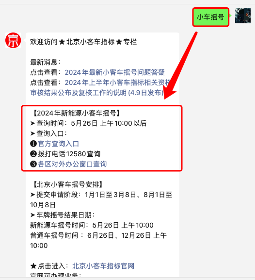 關(guān)注【大京事】微信公眾號(hào),在對(duì)話框回復(fù)“小車搖號(hào)”即可獲取最新北京市小車指標(biāo)申請(qǐng)入口、搖號(hào)結(jié)果查詢、復(fù)查申請(qǐng)、中簽公示等內(nèi)容。