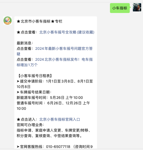 大家可以微信搜索【大京事】公眾號,在聊天對話框內(nèi)回復(fù)【小車指標(biāo)】即可獲取北京小客車申請入口、搖號查詢、家庭積分計(jì)算規(guī)則、申請材料清單等信息。